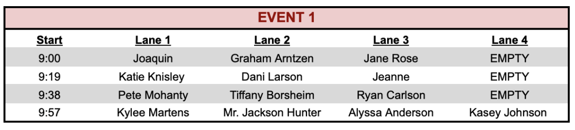 Note: Times right now are subject to change, but it is our commitment to start Event 1 at 9:00am and be done (including awards) by 2:30pm